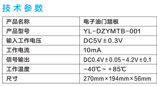 产品介绍:电子油门踏板是汽车驱动系统动力调节的关键组成部分,采用非接触式传感器,根据踏板的角度变化,给汽车驱动系统控制单元提供对应的电压输入信号,控制单元按照输入的电压信号转换成控制器信号后控制汽车的动力输出,响应时间快,控制精度高。